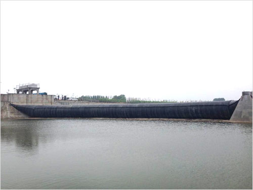 ? ? ? ?大沽河攔河壩工程采用橡膠壩加調(diào)節(jié)閘相結(jié)合形式,橡膠壩單孔凈寬49m,壩袋高度3m,共6孔,采用書(shū)脊式充氣壩袋,為弧形結(jié)構(gòu),采用國(guó)內(nèi)的一次性整體成型、整體硫化工藝,壩袋外表平整美觀、無(wú)搭接縫。整道橡膠壩呈“C”型布置,結(jié)構(gòu)新穎,是國(guó)內(nèi)第一個(gè)弧形書(shū)脊式橡膠壩,為大沽河綜合治理增添了一道亮麗的風(fēng)景線。